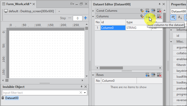 nexacro studioツールバーでデータセットを選択した状態で、デザイン領域任意の場所をクリックすると、データセットが追加されます。データセットは、画面に表示されるコンポーネントではなく、内部でデータを管理するために使用されるコンポーネントであるため、Invisible Objects項目に管理されます。