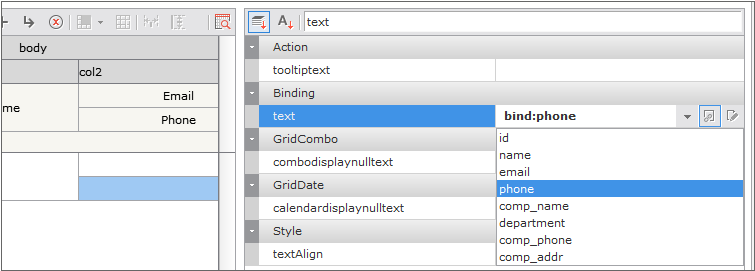 GridコンポーネントとバインドされたDatasetがある場合、Datasetに設定された列のリストをエディタで確認することができます。textプロパティに直接「bind:id」という値を入力するか、リストから「id」項目を選択することができます。