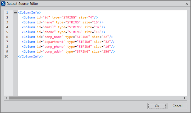 <ColumnInfo> <Column id="id" type="STRING" size="4" description="id"/> <Column id="name" type="STRING" size="16" description="名前"/> <Column id="email" type="STRING" size="32" description="メール"/> <Column id="phone" type="STRING" size="16" description="電話番号"/> <Column id="comp_name" type="STRING" size="32" description="会社"/> <Column id="department" type="STRING" size="32" description="部署"/> <Column id="comp_phone" type="STRING" size="16" description="会社連絡先"/> <Column id="comp_addr" type="STRING" size="256" description="会社住所"/> </ColumnInfo>
