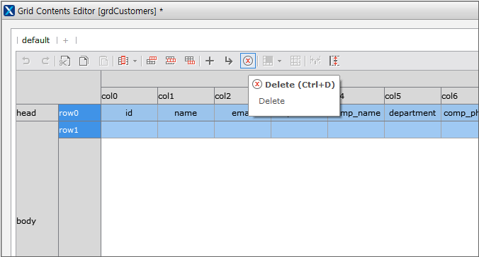 新しい型を編集するために既存の設定された内容を削除します。グリッド・コンテンツ・エディタでrow0項目を選択して、キーボードのShiftキーもしくはCtrlキーを押しながらrow1項目を選択して、エディタ上部のツールバーでDeleteを選択して、自動生成されたフォーマットを削除します。