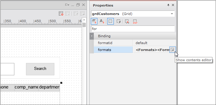 グリッドとデータセットを紐づける作業によって、自動的にformatsプロパティの値が作成されましたが、他のフォーマットでデータを表記したい場合は、グリッド・コンテンツ・エディタでフォーマットを作成することができます。グリッドをダブルクリックするか、プロパティウィンドウformatsプロパティと連携されているボタンをクリックすると、グリッド・コンテンツ・エディタが実行されます。