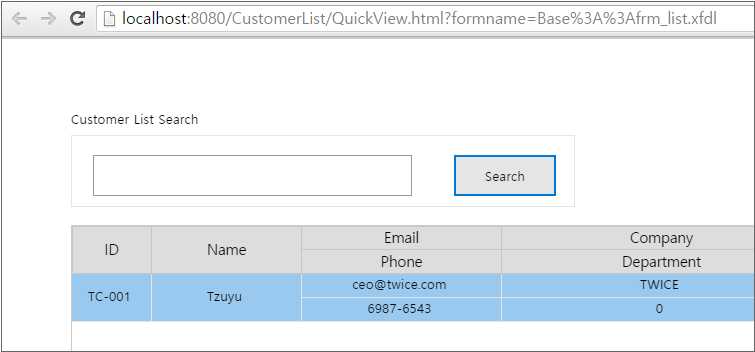 指定されたWebブラウザが実行されながら、実行されたNexacroアプリを確認することができます。 Searchボタンをクリックすると、スクリプトで追加したデータがグリッドに表示されます。
