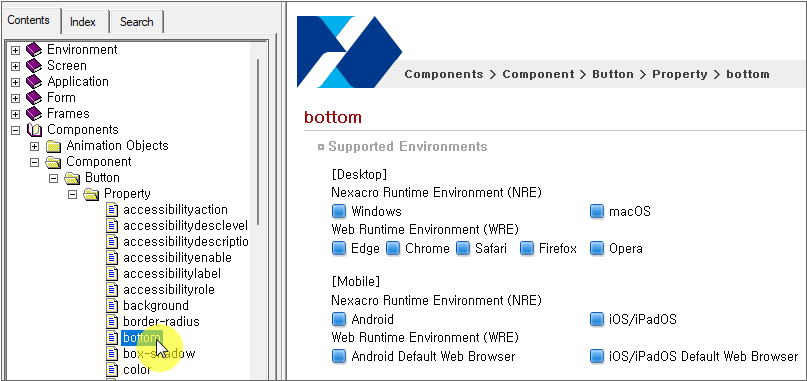 원하는 항목을 클릭하면 해당 속성, 메서드, 이벤트에 대한 설명이 오른쪽에 표시됩니다.