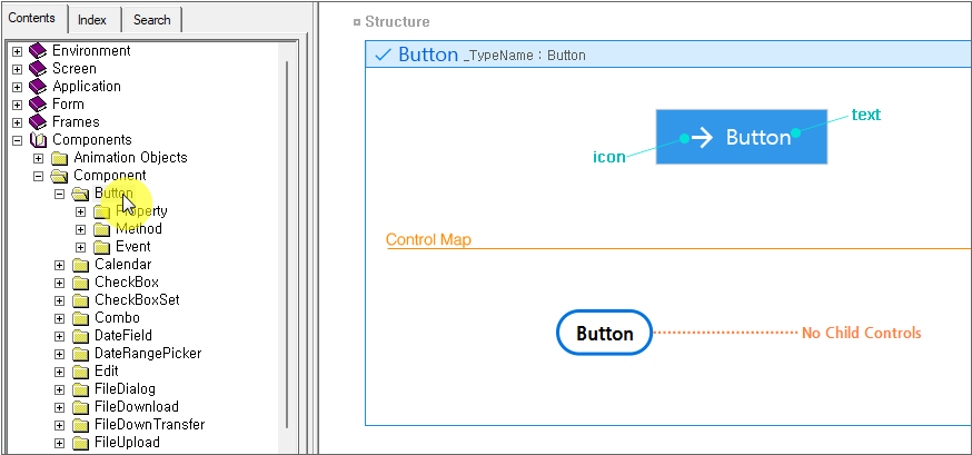 컴포넌트(오브젝트) 항목을 클릭하면 해당 속성, 메서드, 이벤트에 대한 설명이 오른쪽에 표시됩니다.