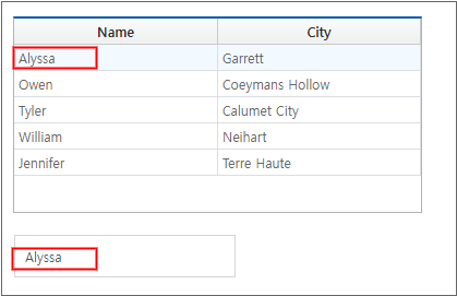 Grid 컴포넌트에 첫 번째 Row가 선택된 상태이고 Edit 컴포넌트에 첫 번째 Row의 Name, City 데이터가 표시되는지 확인합니다.