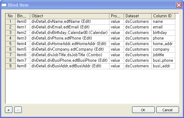Compnent drawn above Division(Div) is identified by having the name of division(Div). By dragging Dataset and enter it into compnent to be bound, “Bind Item” window is opened.