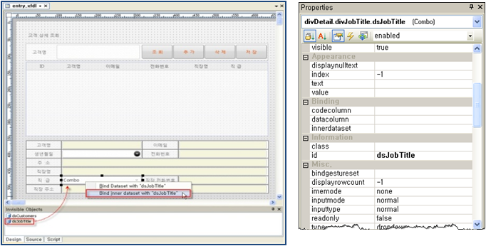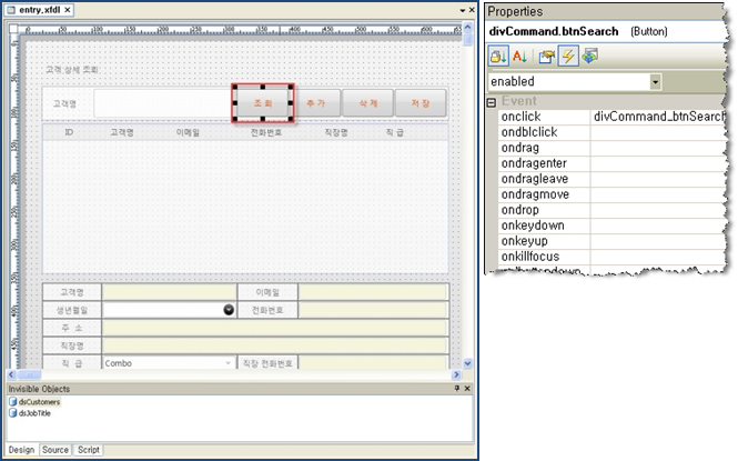 Clicking search button creates script to generate new data at Dataset. First, click search button and select “onclick” among the event list in “Properties” window. Register functions to bind.