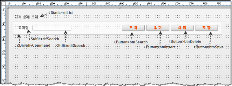As the figure show, generate Static, Div, btton and place them on the form. If placing similar components in a row, through using buttons of copy/paste function and arrow buttons, placement would be much easier.