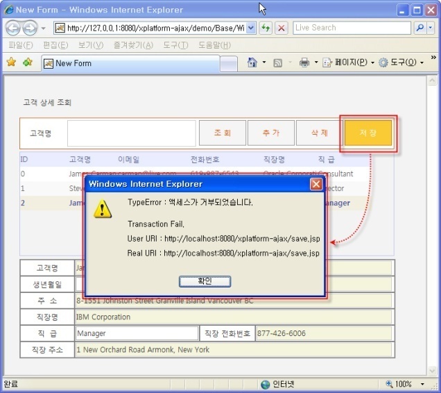 By clicking save button to call service, both contents of task for data which is additionally added and for data which is deleted are applied to the server. However, since save.jsp is not created now, transaction error would occur. By clicking save button, call the service and confirm the error message as follows: