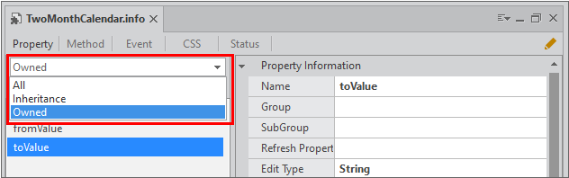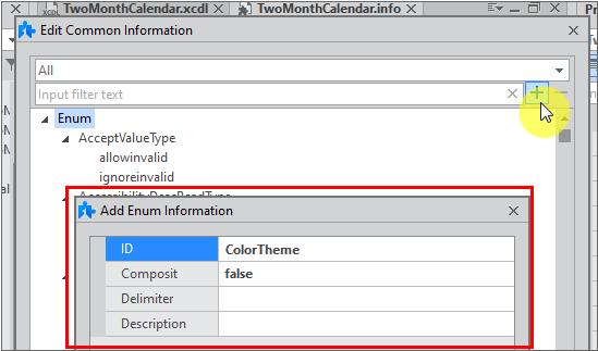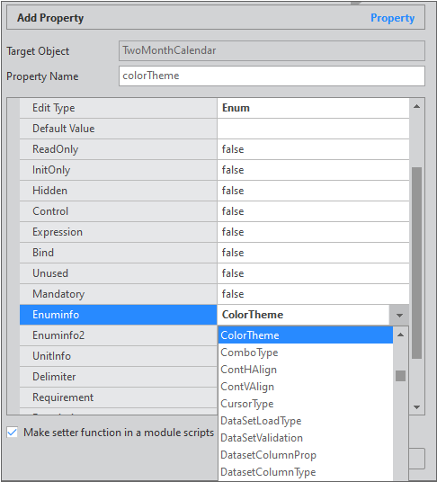 Calendar 컴포넌트의 스타일을 변경할 수 있는 속성을 추가합니다. 속성 이름은 colorTheme 입니다. 속성을 추가하기 전에 EnumInfo부터 추가해주어야 합니다.