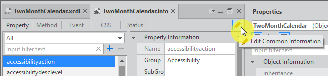 속성, 메소드, 이벤트를 추가하는 위자드에서 세부 항목을 설정할 수 있는데 이를 메타인포라고 합니다. Project Explorer에서 MetaInfo 파일 아래에 오브젝트의 Property, Method, Event 항목을 선택하고 더블 클릭하면 세부 항목을 편집할 수 있습니다.