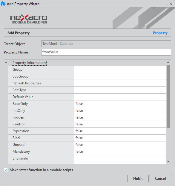 "Make setter function in a module scripts" 항목에서는 속성의 Setter Function 스켈레톤 코드 자동 생성 여부를 설정합니다. 메타인포 항목 unused, readonly, initonly 중에서 하나라도 true로 설정한 경우, 해당 체크박스는 비활성화 됩니다.