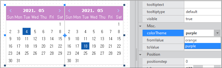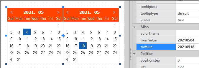 Calendar 컴포넌트에서 선택한 값(value)에 바로 접근할 수 있는 속성을 추가합니다. 속성 이름은 fromValue, toValue 입니다.