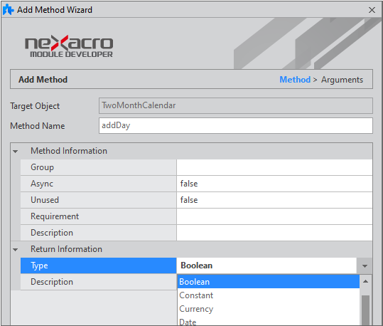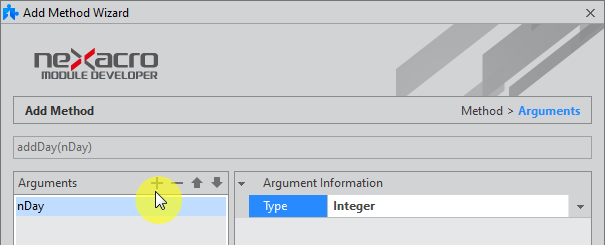 Method Information 항목에서는 메소드 관련 정보를 설정할 수 있습니다. 예제에서는 두 개의 Calendar 컴포넌트에서 선택한 날짜 사이의 차이를 계산하고 반환해주는 메소드를 작성할 겁니다. Return Information 항목에서 Type 값을 "Integer"로 설정합니다.
