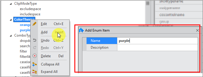 추가한 Enum 항목을 선택하고 컨텍스트 메뉴에서 [Add] 항목을 선택한 후 [Add Enum Item] 창에서 "orange", "purple" 항목을 추가합니다.