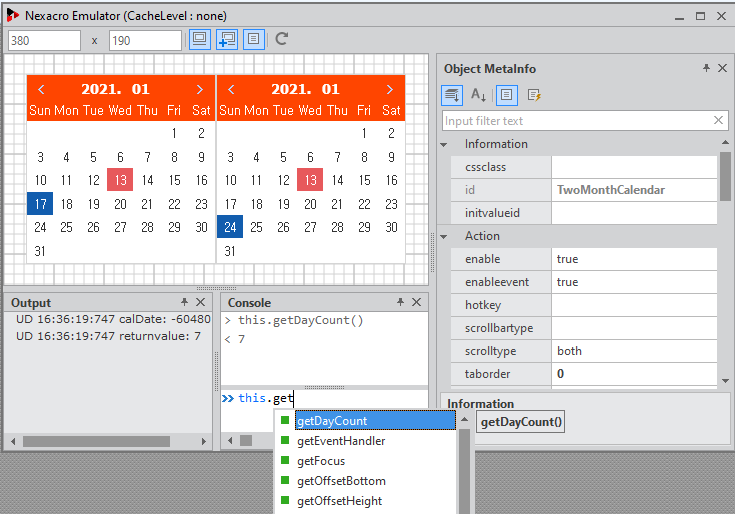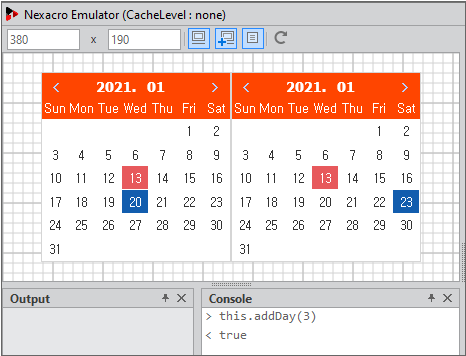 에뮬레이터를 실행하고 첫 번째 Calendar 컴포넌트와 두 번째 Calendar 컴포넌트에서 날짜를 선택한 후 콘솔창에서 추가한 메소드를 호출하고 반환되는 값을 확인합니다.