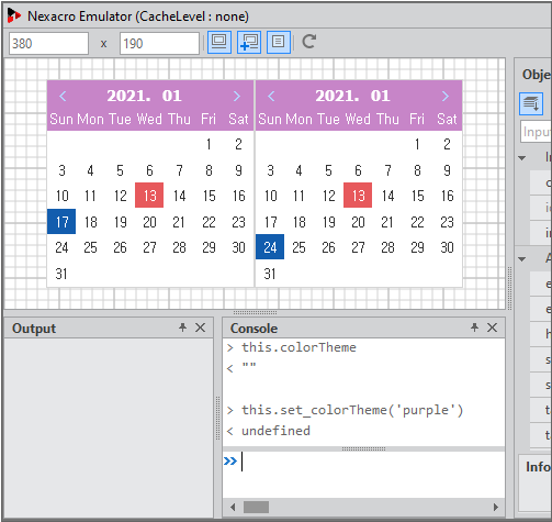 에뮬레이터를 실행하고 첫 번째 Calendar 컴포넌트에서 날짜를 선택한 후 콘솔창에서 속성값을 확인합니다.