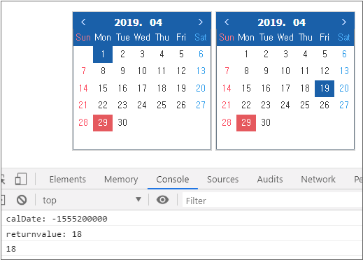 Run the emulator, select the dates from the first and second Calendar components, call the added method in the console window, and check the returned value.
