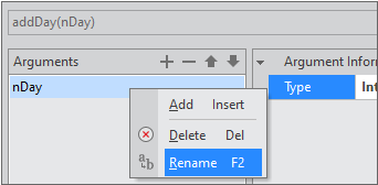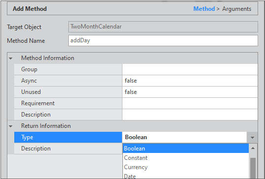 You can set method related information in the Method Information item. In the example, the number passed as the parameter is added to the first Calendar date to be set in the second Calendar component and the result value is returned. Set the Type value to "Boolean" in the Return Information item.