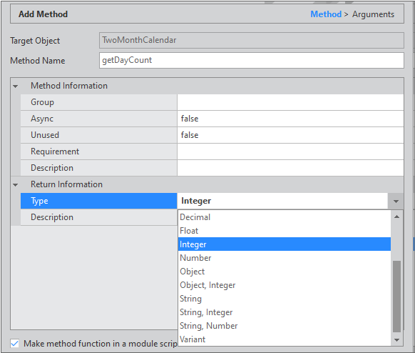 You can set method related information in the Method Information item. In the example, we will generate a method that calculates and returns the difference between the selected dates of two Calendar components. Set the Type value to "Integer" in the Return Information item.