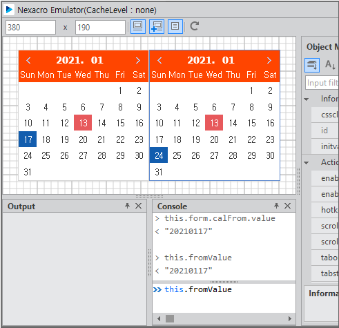 Run the emulator, select the date in the first Calendar component, and check the property value in the console window.
