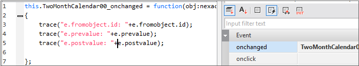 Select the Calendar component in the design tab and generate the onchanged event function as below. The generated event function can be checked in the Script tab.