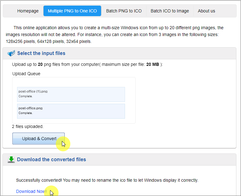 If you upload two image files by clicking the [Upload & Convert] button, it will convert to the ico file, and a link to download the ico file will be displayed.