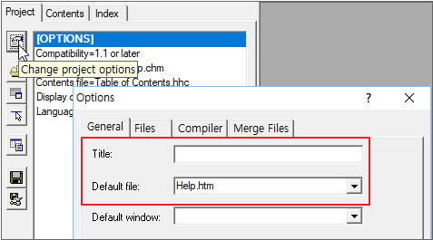 Enter the Title item in the Options window and enter the Help.htm file in the Default file item.