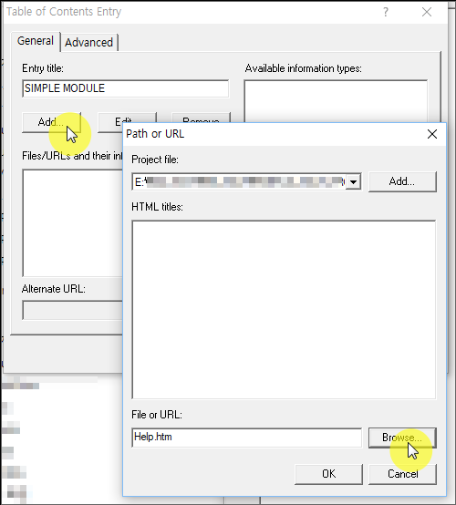Enter "SIMPLE MODULE" in the Entry title item and click the [Add] button to display a window for selecting a file. Click the [Browse] button and select the Help.htm file generated earlier.
