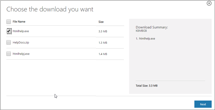 Click the [Download] button, select the "htmlhelp.exe" file from the list of files, and click the [Next] button.