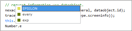 Version 옵션을 "ECMAScript 2015(ES6)"로 선택한 후 스크립트 편집창에서 "Number.e"를 입력했을때 표시되는 인텔리센스 화면입니다. ES6부터 지원하는 "Number.EPSILON" 속성이 추가로 표시됩니다.