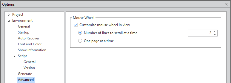 Customize mouse wheel in view | 텍스트 에디터에서 마우스 휠 동작 옵션을 적용할지 여부를 체크합니다. 윈도우 설정과 별개로 넥사크로 스튜디오 내에서만 적용하는 옵션입니다. |