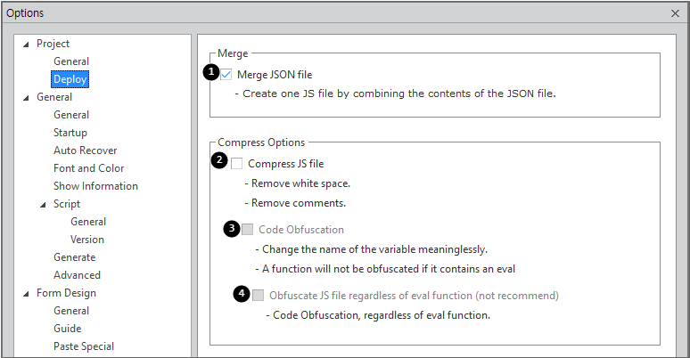 2 | Compress | 2 공백문자와 주석을 제거합니다. 3 JavaScript 파일을 난독화합니다. 4 eval 함수와 상관없이 난독화합니다 (권장하지 않는 옵션입니다). |