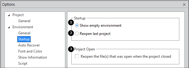 3 | Reopen the file(s)... | 프로젝트을 열 때 마지막에 열려있던 파일을 같이 열지 여부 설정 |