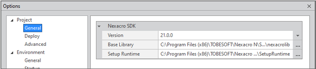 Nexacro SDK | 프로젝트에서 사용할 SDK 버전을 선택합니다. SDK 폴더에 설치된 SDK 버전 중에서 선택할 수 있습니다. - Base Library: 선택한 SDK에 해당하는 Base Library 폴더를 표시합니다. - Setup Runtime: 선택한 SDK에 해당하는 Setup Runtime 폴더를 표시합니다. |