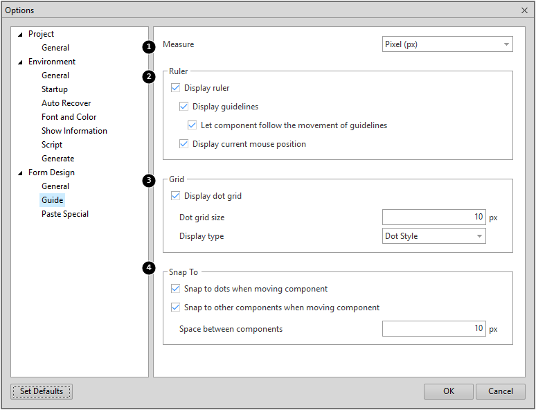 Form 디자인 화면의 눈금자와 가이드 라인, Grid, Snap 기능에 대한 옵션을 설정합니다.