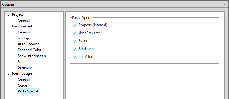 Form Design에서 지원되는 ‘Paste Special’기능에 적용하는 옵션을 설정합니다.