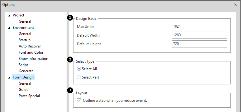 Form Design관련 Option을 설정합니다.