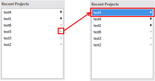 • 특정 프로젝트를 "Recent Projects" 목록에 항상 보이도록 고정할 수 있는 기능을 추가했습니다. >> "Recent Project" 목록을 갱신해도 항상 상단에 표시합니다. >> "Start Page의 "Recent Project" 목록 우측의 핀을 클릭하면 해당 프로젝트를 고정 할 수 있습니다. >> "Start Page의 "Recent Project"의 팝업 메뉴를 통해서 해당 프로젝트를 고정할 수 있습니다. • |
