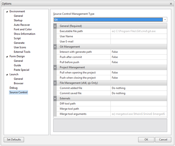 • Git 연동은 "nexacrostudio 메뉴의 [Option] - [Source Control]"의 "Source Control Management Type"에서 설정할 수 있습니다.