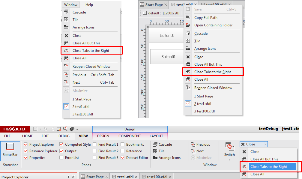 • 현재 활성화 된 View의 우측 View를 모두 닫을 수 있는 기능을 추가했습니다. >> 해당 기능은 "nexacrostudio 메뉴의 [Windows] - [Close Tabs to the Right]", "nexacrostudio 리본 메뉴의 "[Close] > Close Tabs to the Right", "편집기 화면의 팝업 메뉴"에서 사용할 수 있습니다. • 최근에 닫은 창을 다시 열 수 있는 기능을 추가했습니다. >> 해당 기능은 "nexacrostudio 메뉴의 [Windows] - [Close Tabs to the Right]", "nexacrostudio 리본 메뉴의 "[Close] > Close Tabs to the Right", "편집기 화면의 팝업 메뉴"에서 사용할 수 있습니다. >> 창을 닫은 기록이 없을 경우에는 메뉴가 비활성화됩니다. • |