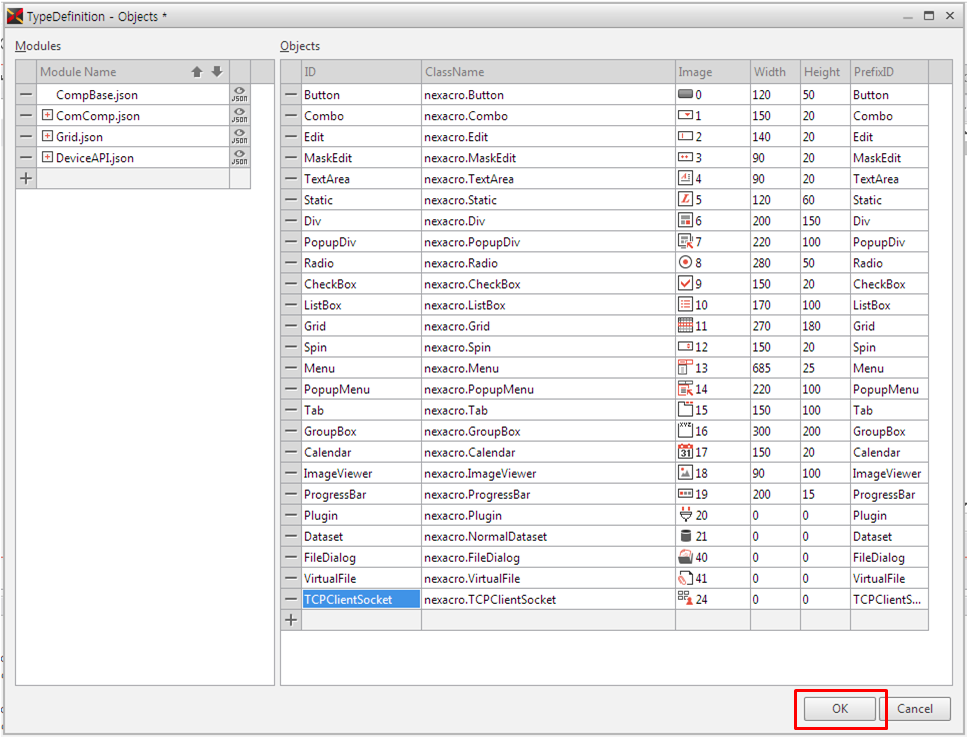 • TCP 통신을 사용하여 서버에 연결하여 정보를 송수신할 수 있는 컴퍼넌트입니다. • TCPClientSocket은 Windows nexacro Browser 환경에서만 사용할수 있습니다. • nexacro14 대비 일부 속성명을 변경하였습니다. (errno -> errorcode / errmsg -> errormsg) • nexacro14의 "onclose/onconnect/onsend" 이벤트를 onsuccess 이벤트로 통합했니다. (ondataarrived, onerror 이벤트는 유지) • onsuccess 이벤트의 SocketEventInfo 속성에 이벤트 발생 원인과 정보를 전달합니다. • nexacrostudio에서 TCPClientSocket은 아래와 같이 추가 후 사용합니다. |