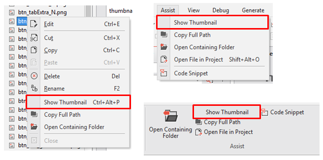 • "Project Explorer/Resource Explorer"에서 관리하는 폼 또는 이미지에 대한 섬네일 이미지를 표시해주는 기능을 추가했습니다. • "Project Explorer/Resource Explorer" 트리의 폼 또는 이미지 선택 후 [우클릭] - [Show Thumbnail] 클릭 시 섬네일 이미지를 확인 할 수 있습니다. |