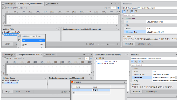 • 넥사크로스튜디오에서 LiteDBConnection의 datasource 속성값이 지정된 DB 파일 오픈이 가능합니다. • 넥사크로스튜디오에서 LiteDBStatement.ldbconnection 속성값에 지정한 ListeDBConnection 오브젝트에 연결된 DB에 대한 퀴리 에디터를 제공합니다. |