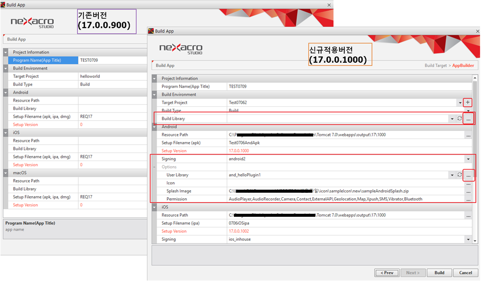 • "iOS/Android/macOS" 어플리케이션 빌드를 위한 AppBuilder 서버의 일부 Admin 기능을 nexacrostudio에 추가했습니다. • nexacrostudio에 추가된 AppBuilder 서버의 Admin 기능은 아래와 같습니다. >> 프로젝트 생성할 수 있는 기능을 추가했습니다. >> Engine Library 등록 및 Update 할 수 있는 기능을 추가했습니다. >> "어플리케이션 Signing 선택 / User Library 선택 / Icon 및 Image 적용 / DeviceAPI Permission 적용"을 할 수 있는 Build 옵션을 추가했습니다. |