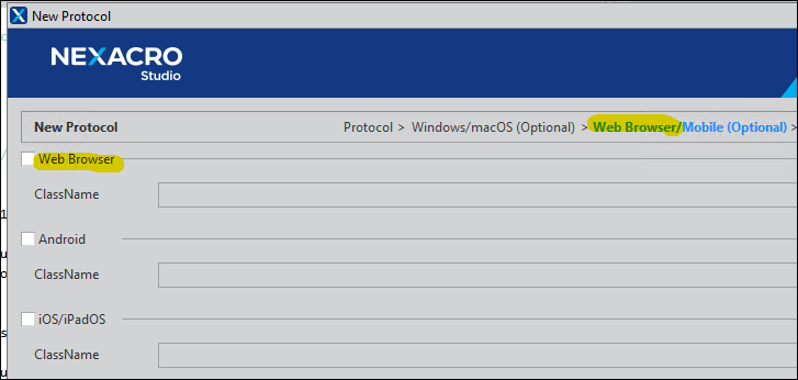 nexacro studioのNew Protocol Wizard画面にて、「HTML5」で表示されていた項目名を「Web Browser」に変更しました。(RP 92601)