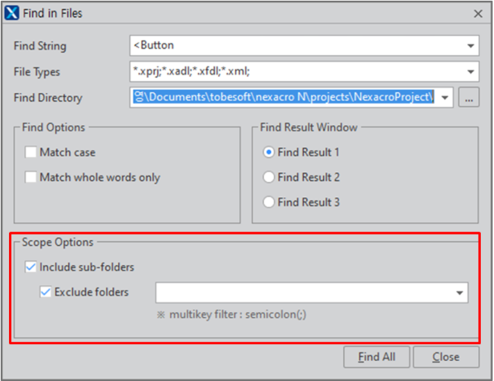 Nexacro Studio의 파일 내 검색(Find in Files) 기능에 제외 디렉토리를 지정하는 옵션을 추가했습니다. (RP 93947)