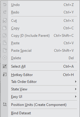 넥사크로 스튜디오 디자인 화면에서 Form 또는 컴포넌트 선택 시 지원하는 컨텍스트 메뉴 항목을 정리했습니다.(RP 92221)