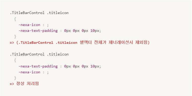 • 셀렉터 내에 값이 없는 스타일이 처음에 정의되는 경우 셀렉터가 무시되는 현상이 있습니다.