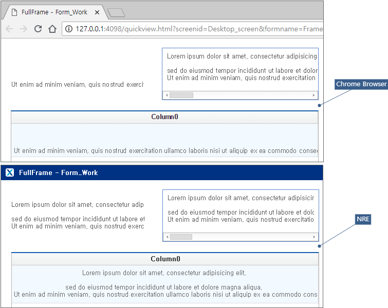 넥사크로 스튜디오 디자인 창, NRE 실행 시에는 WRE와 다른 방식으로 화면을 처리해 텍스트 위치가 달라지는 현상이 없습니다.